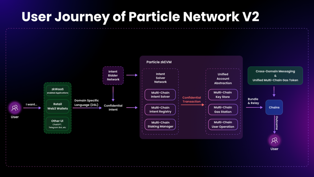 Particle Network V2具备完善的协议和执行环境。在一款规模庞大的Web3金融平台上,用户只需说明理财愿望,系统便会自动处理相关技术和协议的细节。