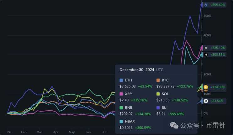 2024 年以太坊价格上涨了 63%。这一数据看起来颇为漂亮。然而,它却被 Solana、XRP 和 SUI 等竞争对手远远地甩在了身后。这不禁让人对它的市场领导地位感到担忧。